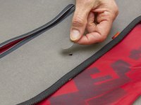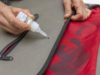Apply the adhesive to both the patch and the damaged area and let it dry for 3 minutes before you press the patch onto the bag in the marked area.