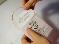 Guide the string through the pin hole, so that about 1/3 of an inch of excess string comes out from behind the pin.