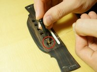 Pin the stings onto the bridge, into the pinholes from left to right in the following order; E(low)-A-D-G-B-E(high).