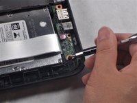 Use a Phillips #0 screwdriver to remove the screw that holds the USB drive in the bottom right corner near the hard drive. Once removed, lift the USB drive off of the hard drive.