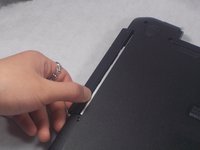 Flip the device around and open it. Use the blue spudger tool to remove the casing around the keyboard space by driving it the crease and propping it up.