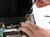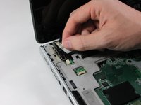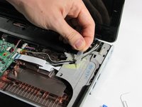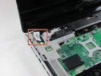Locate and disconnect the audio/infrared cable from the system board on the right hand side by pulling the blue and white tab to the left.