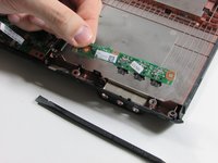 Starting in the front of the laptop, use a flat plastic spudger to gently pry the silver/chrome plastic bar off of the front of the laptop.