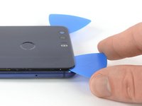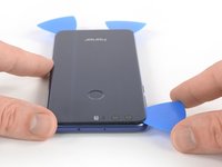 Insert a fourth opening pick at the bottom edge of the phone and slide it to the bottom left corner. Leave it there to prevent the adhesive from resealing.