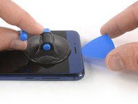 Insert the tip of an opening pick in the gap you created and slide it to top right corner of the phone. Leave it there to prevent the adhesive from resealing.