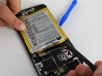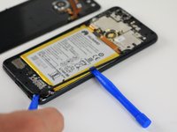Once all the adhesive has been removed from the battery, use the spudger and plastic opening tools to gently pry the battery away from the frame.
