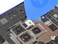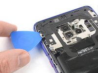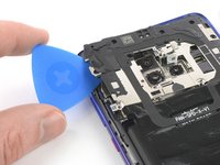 Use an opening pick to carefully pry the flash assembly off the motherboard cover and fold it into the direction of the battery. Avoid damaging the flash assembly flex cable.