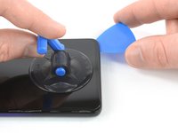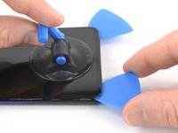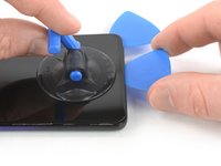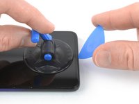 Pull the suction cup upwards and insert an opening pick in the gap between the display glass and the midframe. Start to cut the adhesive by sliding the opening pick to the bottom right corner.