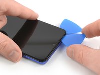 Slide the tip of the opening pick from the bottom left corner along the side of the phone to cut the adhesive.