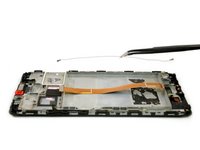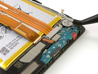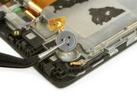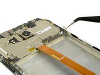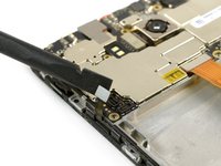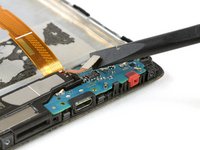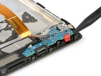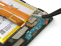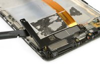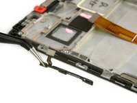 Use the flat end of a spudger to disconnect the volume and power flex cable on the bottom left side of the mainboard.
