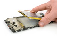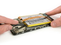 Lift the top end of the battery to pull the battery off of the remaining adhesive strip.