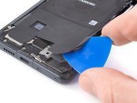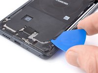 Slide an opening pick under the black adhesive at the bottom right of the charging coil.