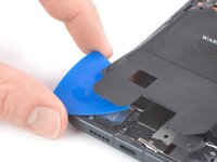 Slide an opening pick under the black adhesive at the bottom left of the charging coil.