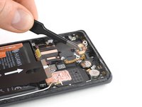 Moving on to the screen, we find the second half of the glass-vibrating earpiece speaker module stuck to the back of the display as we fight through the adhesive.