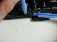 Insert the plastic opening tools towards the right side of the latch.