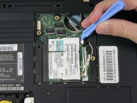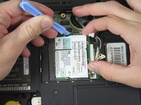 Use the plastic opening tool to pry the hinges on the side of the wireless card. These hinges hold the wireless card in place.