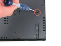 Turn the computer over to see the small tab on the battery located near the top of the Thinkpad.