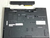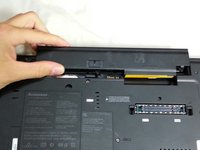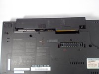 Turn the computer over so that you can see the battery release tab located near the top of the Thinkpad.