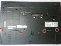 Flip your computer over and remove the four indicated screws with the Phillips #1 screwdriver.