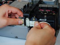 Gently pull the white tab on the right side of the silver power housing by pinching each side of it.