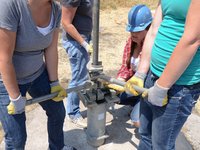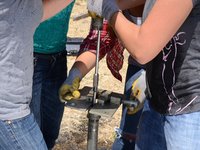 Once everyone is securely holding the pipe, loosen the pipe vise.