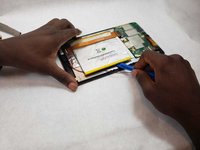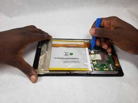 Pry the battery from the back of the LCD screen using the opening tool. Due to the strong adhesive between the battery and screen, this may take some time.