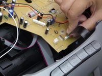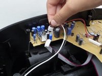 Detach the thicker, white and pink cord on the smaller yellow plate on the front panel by pulling away.