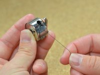 Slide the thread from the slit straight up along the groove and into the open hole on the bobbin case's side.