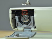 Use your fingernail to lift the lever on the back of the bobbin case. Hold the lever open.