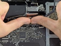 Squeeze the two display data cable connector arms together to unlock it from its socket on the logic board.