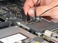 If the cable is glued to the chassis, use a heated iOpener or a hair dryer to soften the adhesive first. You can then slide an opening pick underneath the cable to loosen it. Never pull on the delicate connectors.