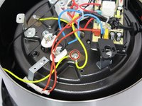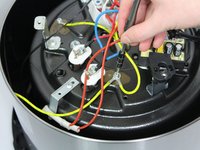 Disconnect the two green-striped yellow wires that are connected onto the bottom of the heating element. Use a PH-1 head screwdriver and turn counter-clockwise to remove the 10-mm screw holding them in place.
