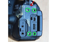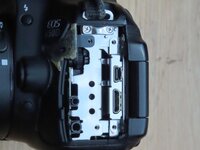 There are two interface terminal caps on the left side of the camera body covering the connectors for the microphone, remote, USB and HDMI cables. These caps tend to tear off after the rubber has hardened over the years.