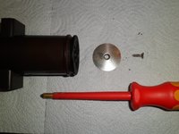On the other side of the piston is the coffee strainer. It's hold in place by a PH2 screw. When the screw is turned out the metal strainer can pushed off.