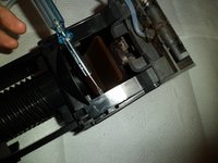 Remove the three T15 screws marked with the red circles. Top two are fine thread and bottom course thread. Note the screw marked with a blue sqaure does not need to be removed to remove the tamping assembly.