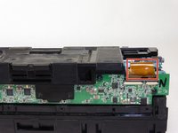 Remove the colored ribbon that connects the green button circuit board to the blue auxiliary board by using your finger to lift the small black tabs that clamp down the ribbon.