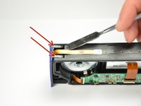• Using the standard metal spudger, carefully pry up the top 2 plastic tabs which hold the exterior button and port cover onto the interior plastic frame.