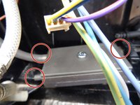 Remove the two Torx T15 screws on the drain motor and take out the motor. The side with the blue cable is marked with a dot.