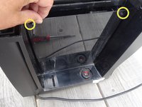 Behind the Jura sign are two screws with an oval head. They have to be removed.
