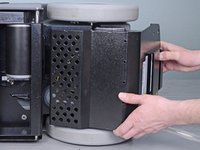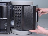 Rotate the bottom cover down toward the bottom of the carpet cleaner, then pull it straight back toward the rear of the carpet cleaner to remove it.