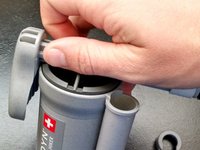 Press the pump handle firmly against the fins and turn the filter counter clockwise.