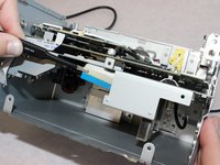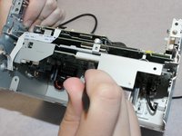 • Flip up the black clasp with a spudger to disconnect the large white ribbon cable connecting the CD drive to the board underneath.
