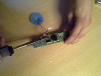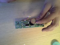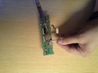 If the voltage is below about 2.75 volts, the battery will have to be removed. Using a soldering iron, melt the solder holding one of the solder tabs to the board. While the solder is molten, pull the solder tab away from the board with a pair of tweezers.