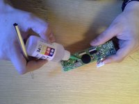 Using isopropyl alcohol and an acid brush, clean the flux residue off the board.
