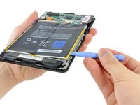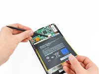 Lever the battery up and work the plastic opening tool down along its edge to release the glue securing it to the frame.