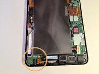 Using the plastic opening tool, carefully lift up the burnt orange tab that is connected to the audio board.