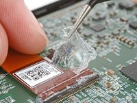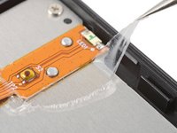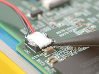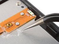 Use the tip of a spudger to scrape the coating along the base of the power button board—enough so you can grab clumps of it with tweezers.