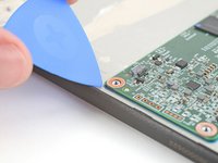 Slide an opening pick under the top left corner of the motherboard and lift it up enough to grip the motherboard with your fingers.