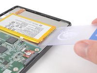 Slide the plastic card under the battery to separate the adhesive and the thin layer of coating.