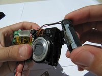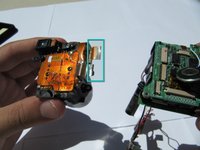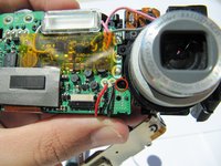 Hold the camera firmly and gently remove the capacitor (attached by adhesive) by wiggling it loose.